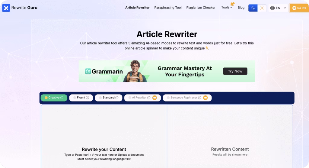 RewriteGuru includes tone presets that help refine short drafts and restore natural flow across compact sections. It suits tasks where writers want to humanize AI writing without processing long documents. The platform works best for small internal notes, short explanations, and fast checks that require a clear tone and stable transitions.