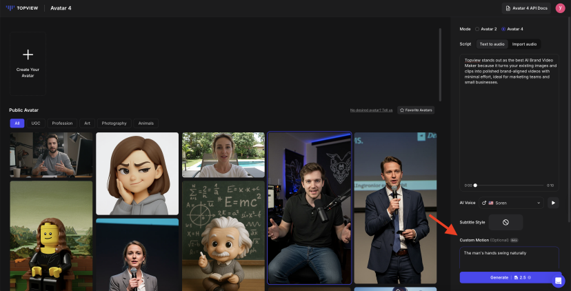 If you’d like, add a quick Custom Motion prompt—something like “smile” or “raise a hand”—to give your avatar more personality.
