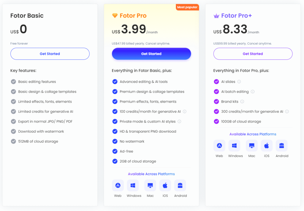 Fotor’s pricing is competitive, especially considering that even the free plan provides full editing and watermark-free exports. The paid plans are worth it for professionals or frequent creators who need high-resolution output and increased AI limits.