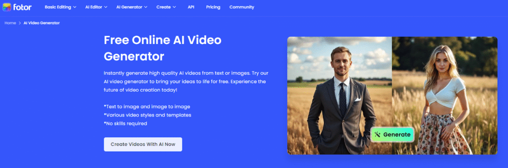The AI is useful with a broad variety of styles of videos, including realistic and cinematic as well as anime, fantasy, and 3D. Its script-to-video option also allows creating cinematic content in a remarkably short amount of time, as the entirety of a blog post or a text prompt can be converted by Fotor into an actual video, and any person can create cinematic content.