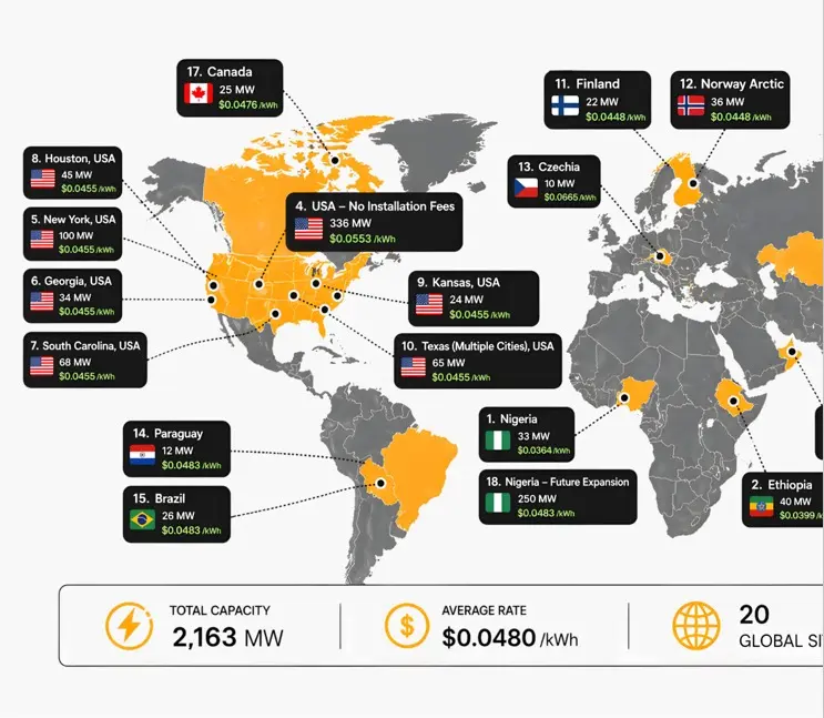 The network includes facilities in Nigeria, Ethiopia, the United Arab Emirates, the United States, Finland, Norway, Germany, Paraguay, Brazil, Kazakhstan, and Canada. Oneminers stated that all 17 locations are either fully operational or ready for immediate deployment, with average uptime exceeding 98 percent and a minimum service-level guarantee of 95 percent, below which clients are fully compensated.