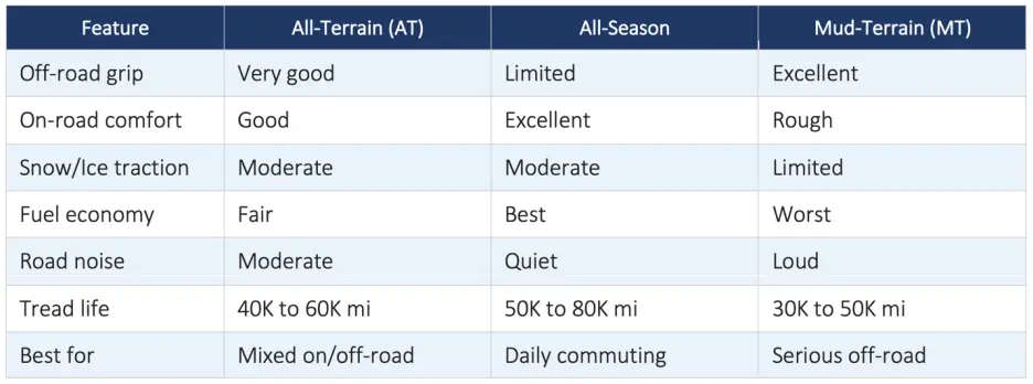 All-Terrain vs All-Season vs Mud-Terrain: Quick Comparison